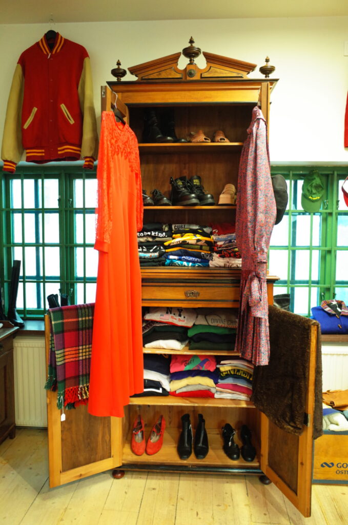– Jag vill att det ska finnas något för alla i min butik och har därför plagg med lite lägre pris. Men jag värdesätter bra kvalitet och därför är vissa plagg lite dyrare. Överlag tror jag att jag har lite billigare priser, om man bortser ifrån de ideella butikerna i stan. Jag fokuserar inte så mycket på en viss typ av märken, utan mer på vad jag tycker är fint och vad jag tror att personer inom min målgrupp skulle gilla. Återbruk är viktigt för mig – är ett plagg helt och rent tycker jag det ska fortsätta användas. Min egen smak tror jag har gjort avtryck i butiken, det är mycket 70-tal, men verkligen inte allt. Eftersom jag sköter allt själv, har jag inrett butiken på mitt sätt och jag tror det skapar en personlig touch till skillnad från de lite större kedjorna i stan. Min butik är ganska liten och inte så överväldigande som det ibland kan kännas i större second hand-butiker. Jag har ett noggrant urval av plagg och möbler för att säkerställa kvalitet.